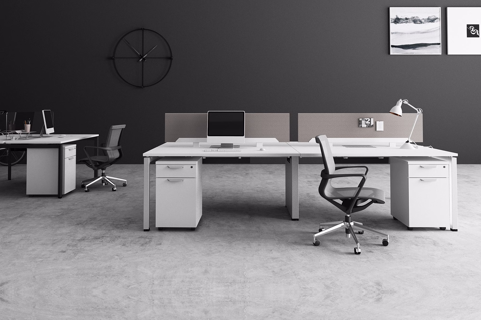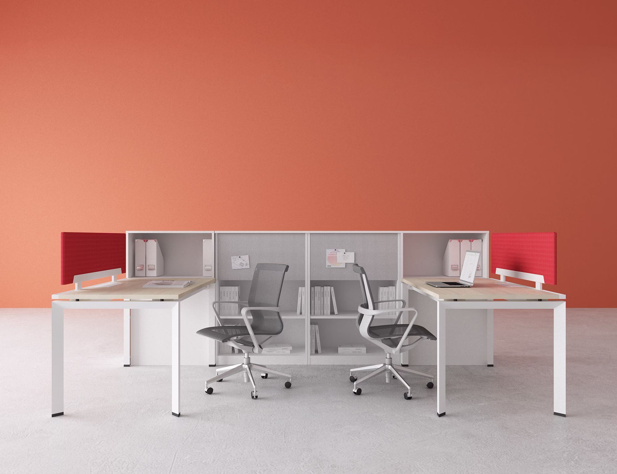 Add on privacy elements as needed with fabric tackboards, glass screens, markerboard and modesty panels