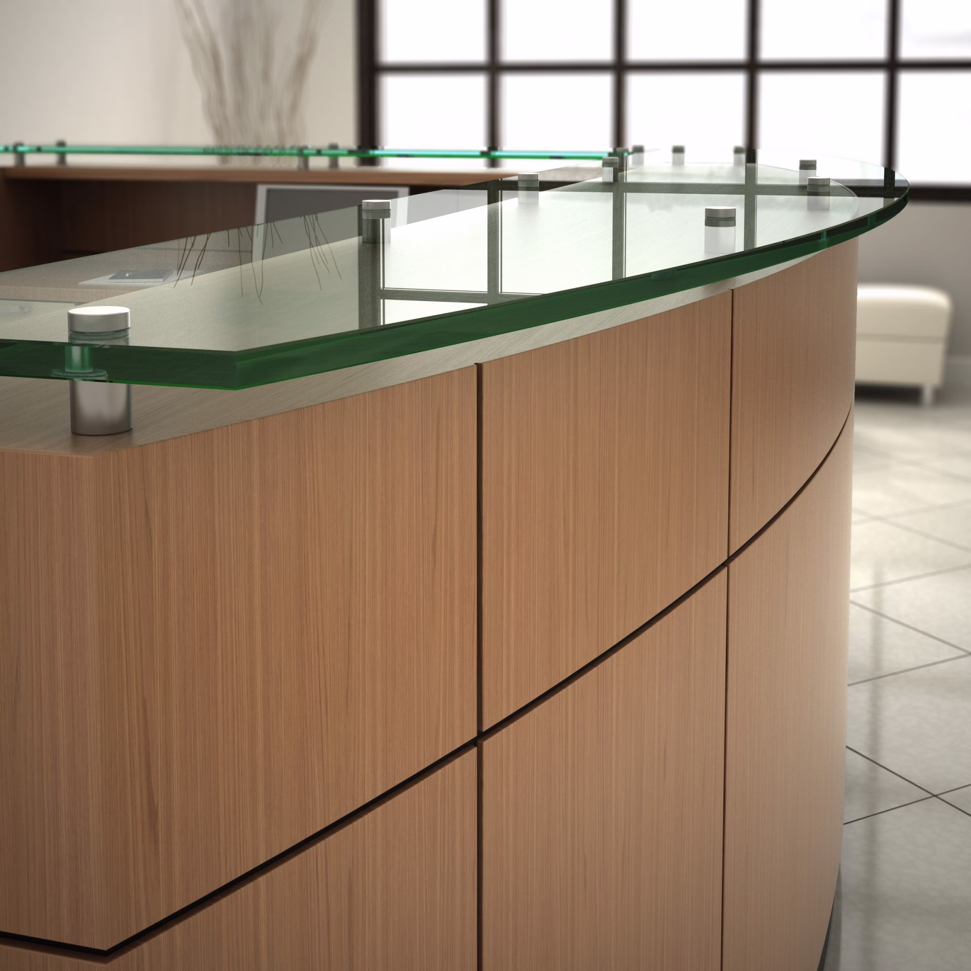 Our Willow Reception line creates an eye-catching first impression, featuring the option of a straight front or bow front design. This is a custom table with the choice of laminate or wood veneer and a glass transaction top with a 3” overhang on satin chrome stand-offs. Additionally, Willow’s design includes engaging accents of black reveals with toekicks and pedestal pulls, available in black or satin finish.