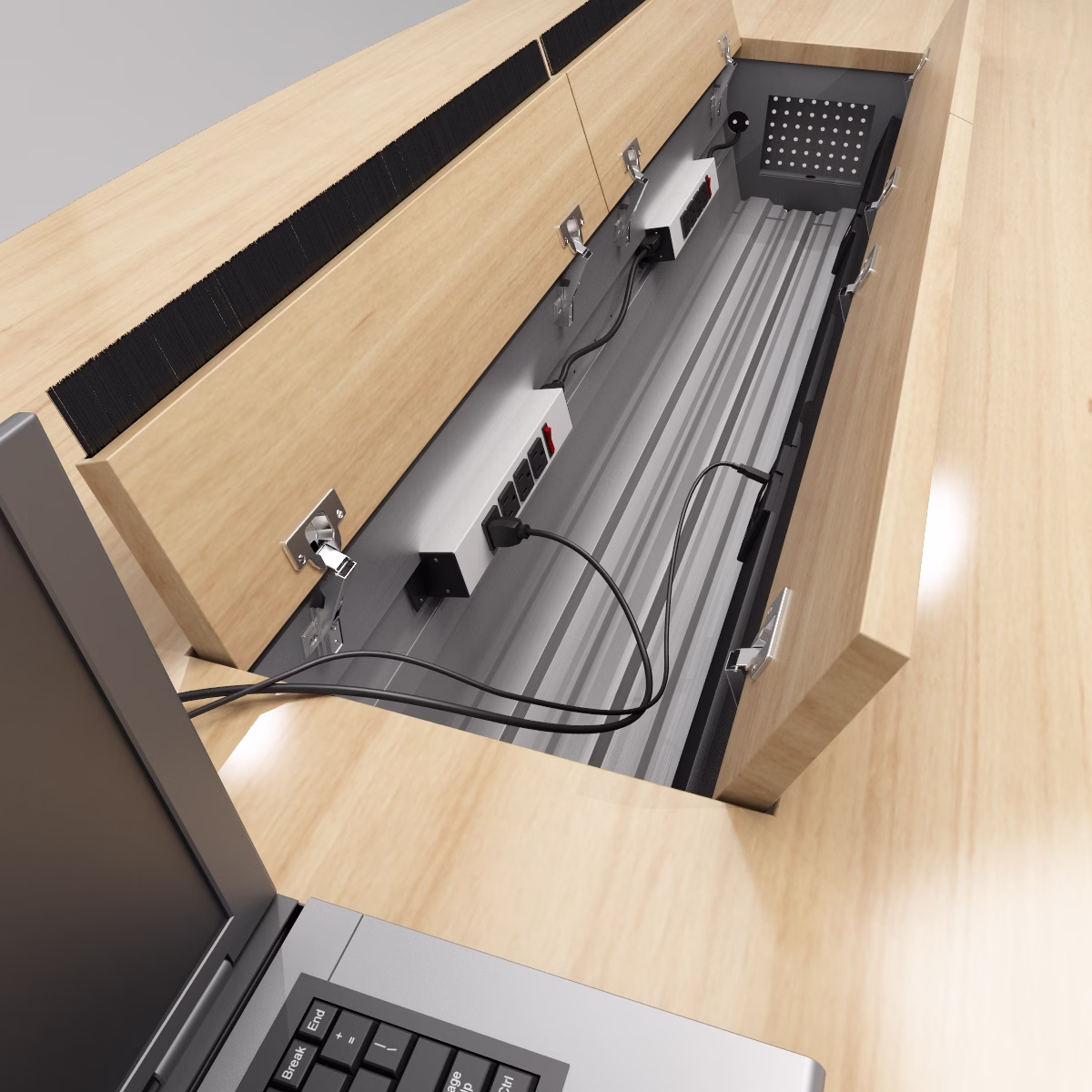 Separate channels organize power and data cables, with entry points on the surface and in the bases