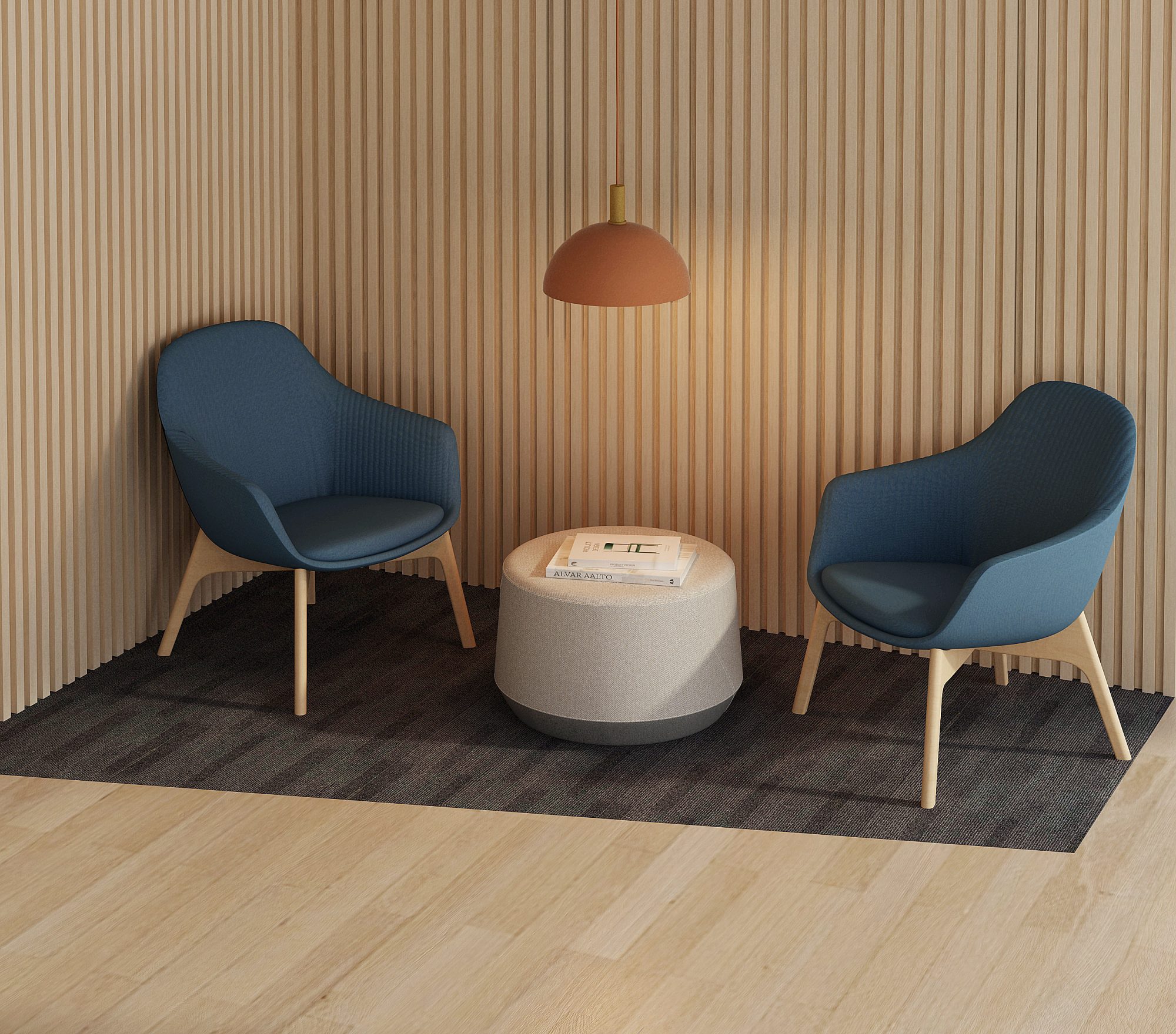 Accent seating is quick and simple; try creating a lounge corner with two blue chairs to encourage great conversation among staff. If you love color on color, go with an accent wall and a matching loveseat or couch to tie it all together. Lining the inside of acoustic/privacy booths with blue can enhance feelings of calmness and serenity while employees spend time in them, possibly helping to increase focus and productivity.