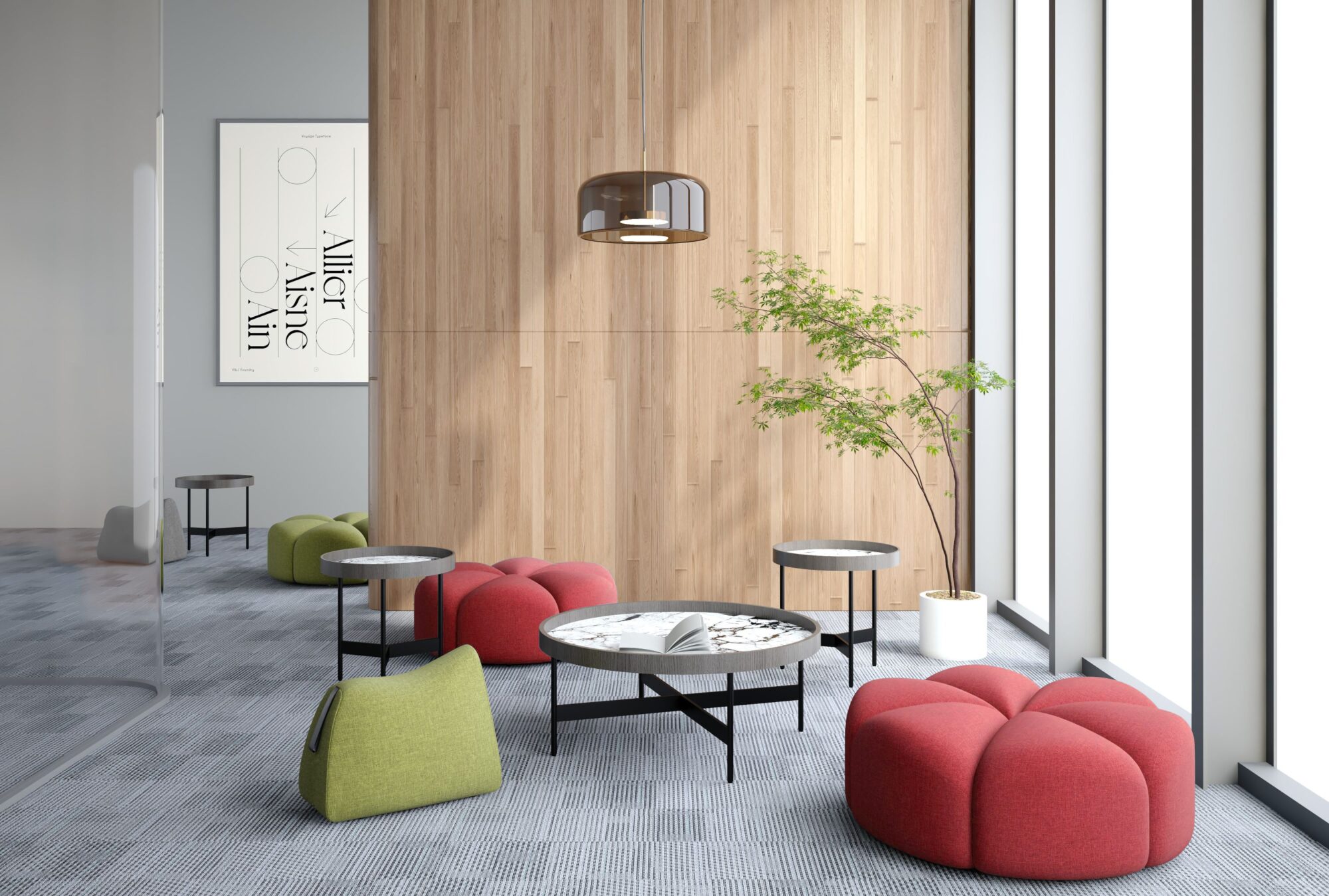 Ready to add some green to your space? Consider peppering green seating around the office, from couches and accent chairs to stools in fun, nature-inspired shapes. Privacy panels at shared desks can also be a great way to add some green directly into one’s line of vision while making the space feel a little more personal.