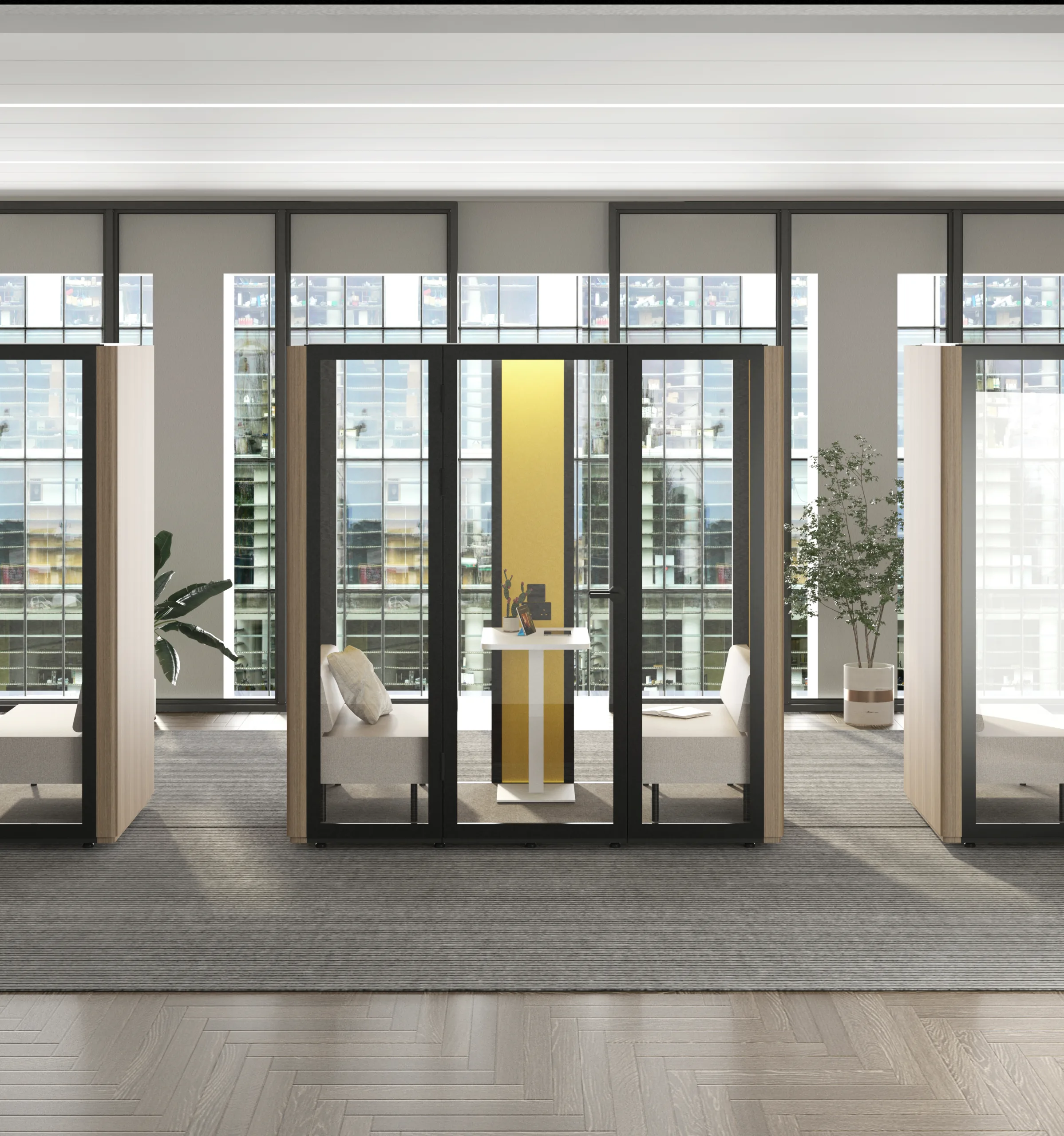 Acoustic panels reduce noise by up to 30 dB, while motion-activated lighting, ventilation, and tempered glass create a comfortable, productive environment. Each feature is designed to support focus and wellbeing throughout the day.