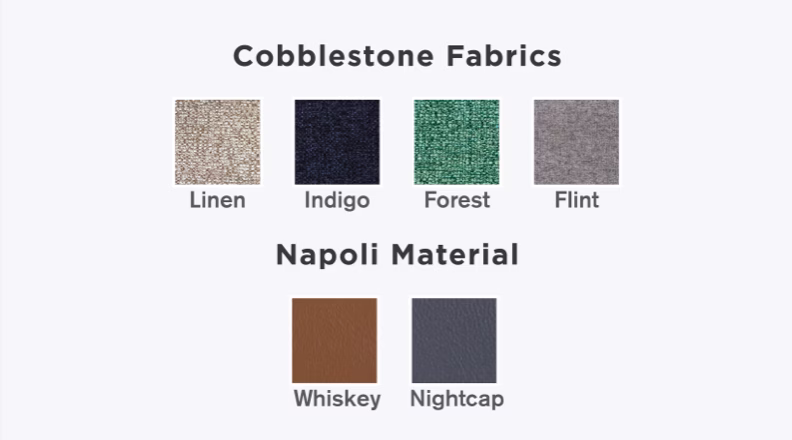 Materials seamlessly join together and create a beautiful contrast of metal and fabrics. Choose from six material options between Cobblestone and Napoli collections.